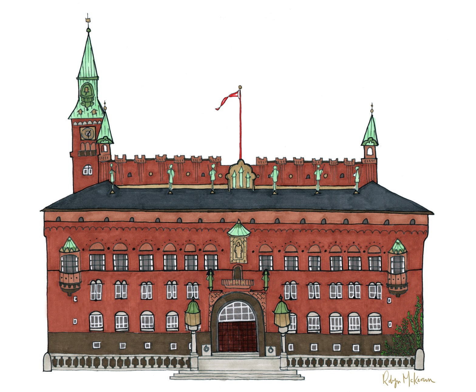 During our assignment to the U.S. Embassy, Denmark, we were married at the Copenhagen city hall. The ceremony was short, but held in a small room with beautiful wedding-themed murals. We received an illustrated booklet with historic information about the room itself but not a picture of the building. Robyn’s work will be a great addition and welcome reminder of the place where we founded our family.